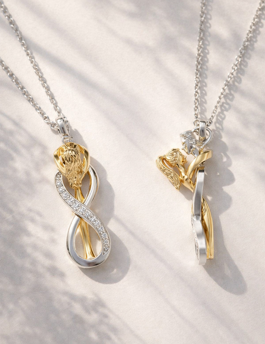 Amoria Infinity, sevginin sonsuz döngüsünü simgeler. 925 ayar gümüşün parlaklığı, altın tonların sıcaklığıyla birleşerek duygusal bir uyum yaratır. Anne ve çocuk figüründen ilham alan bu tasarım, korumayı ve sevgiyi zarafetle taşır. Her bakışta bir “amore” hatırlatması.