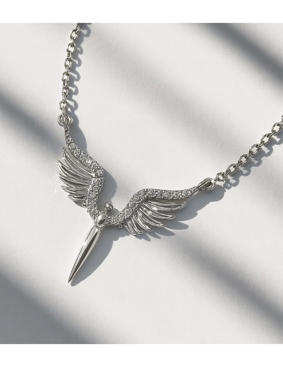 Archangel Silver, koruyucu Mikail meleğinin kudretinden ve saf ışıktan ilham alan bir tasarımdır. Tamamı 925 ayar gümüşten üretilen bu özel kolye, modern formda kanat motifleriyle işlenmiş olup ilahi gücü, adaleti ve içsel dengeyi simgeler. Kanat çizgileri, Mikail’in koruyucu enerjisini zarif bir estetikle taşırken; yüzeyine yerleştirilen fancy kesim taşlar ışığı yakalayıp her hareketle birlikte parıldar. Bu zarif parça, hem minimalist bir tasarım anlayışını hem de derin bir anlamı bir arada sunar. Archangel Silver, günlük kombinlere sade bir zarafet katarak ruhsal anlam taşıyan bir aksesuar olmanın ötesine geçer — bir “koruyucu sembol” olarak ışığın gücünü taşır.