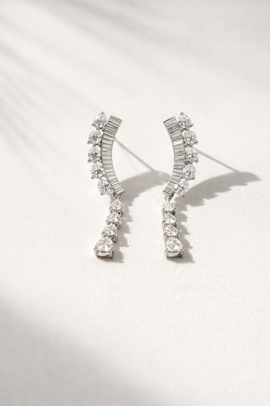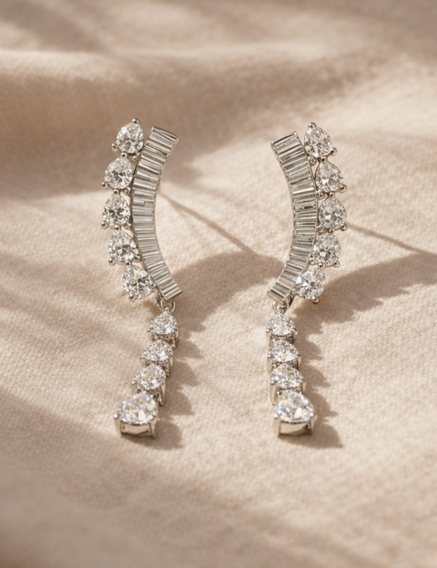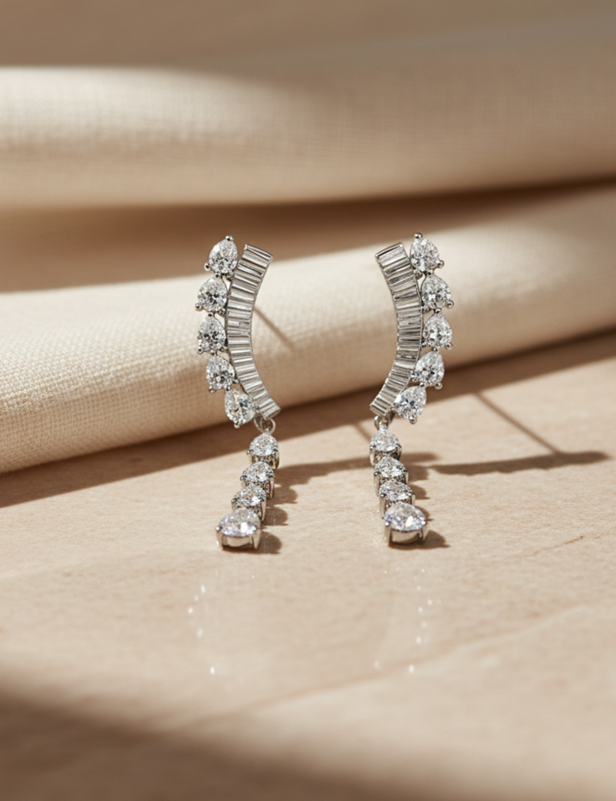 925 ayar gümüşten üretilen bu özel tasarım, markamızın temel yaklaşımı doğrultusunda zirkon içermez. Bunun yerine berraklığı, net ışık kırılımı ve rafine ışıltısıyla öne çıkan fancy taşlar kullanılır. Bu tercih, küpeye daha sofistike ve yüksek mücevher hissi kazandırır.