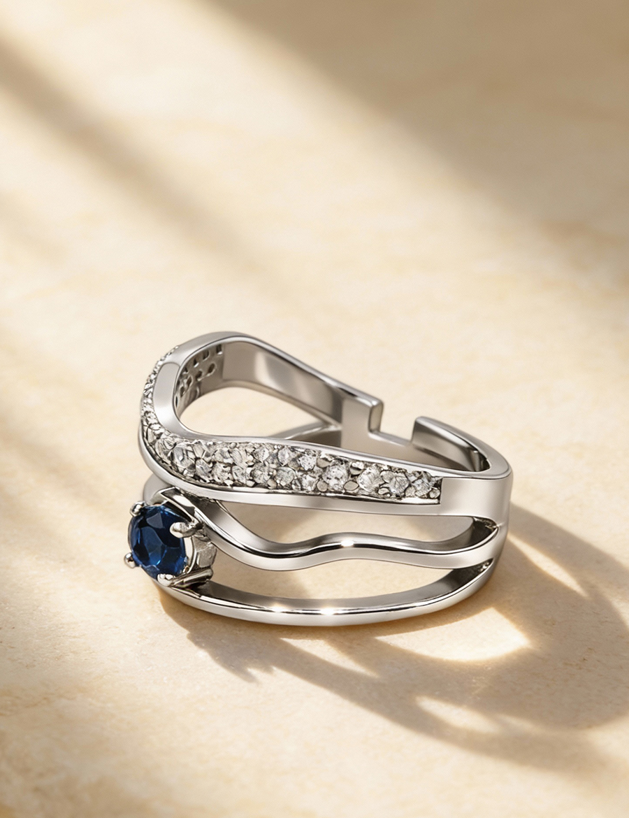 Azure Wave Ring, okyanusun doğal dalga hareketinden ilham alınarak tasarlanmış modern ve zarif bir yüzüktür. Akışkan hatları, tasarımın her açıdan canlı ve dinamik görünmesini sağlarken; merkezde yer alan derin mavi fancy taş, yüzüğe güçlü bir enerji ve lüks bir karakter kazandırır.