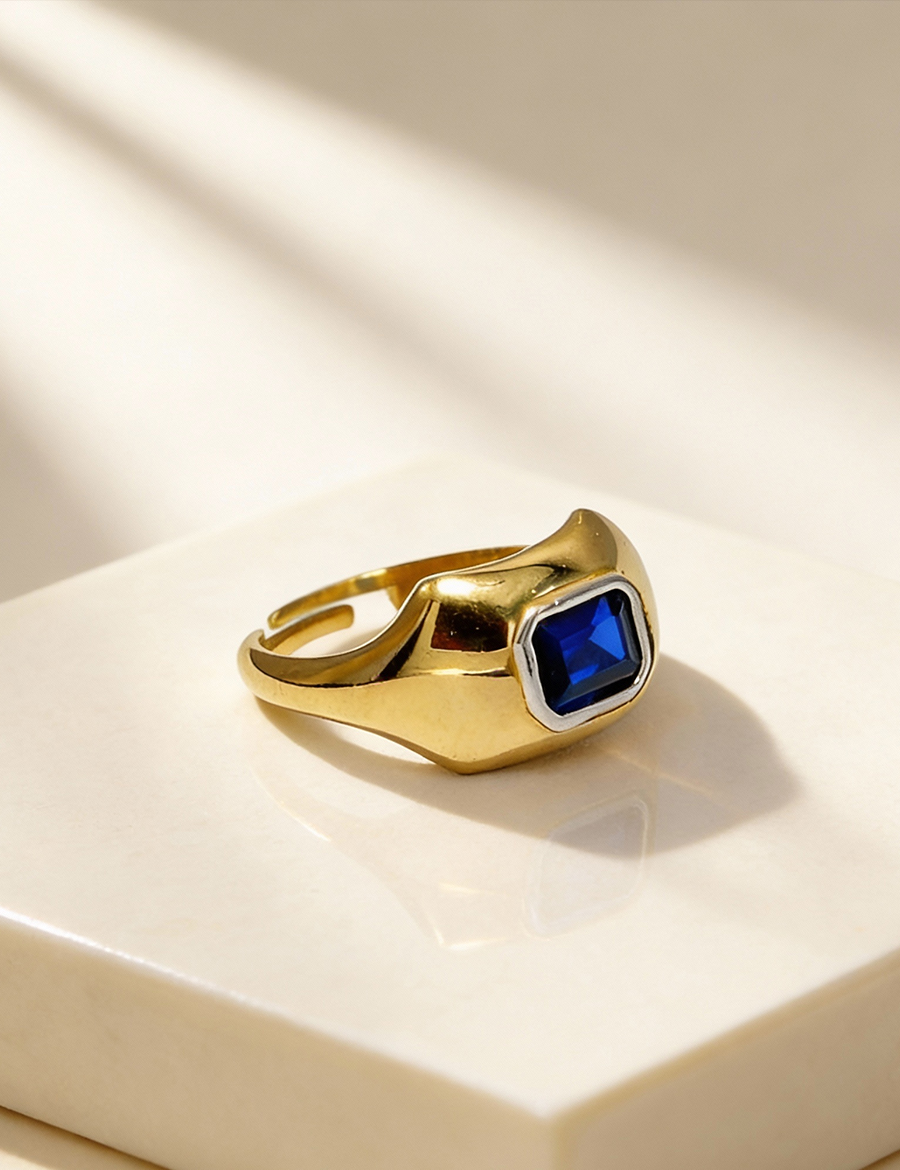 Blue Axis Ring; güçlü merkez enerjisi, zamansız sade formu ve premium işçiliğiyle modern koleksiyonların öne çıkan statement parçalarından biridir.