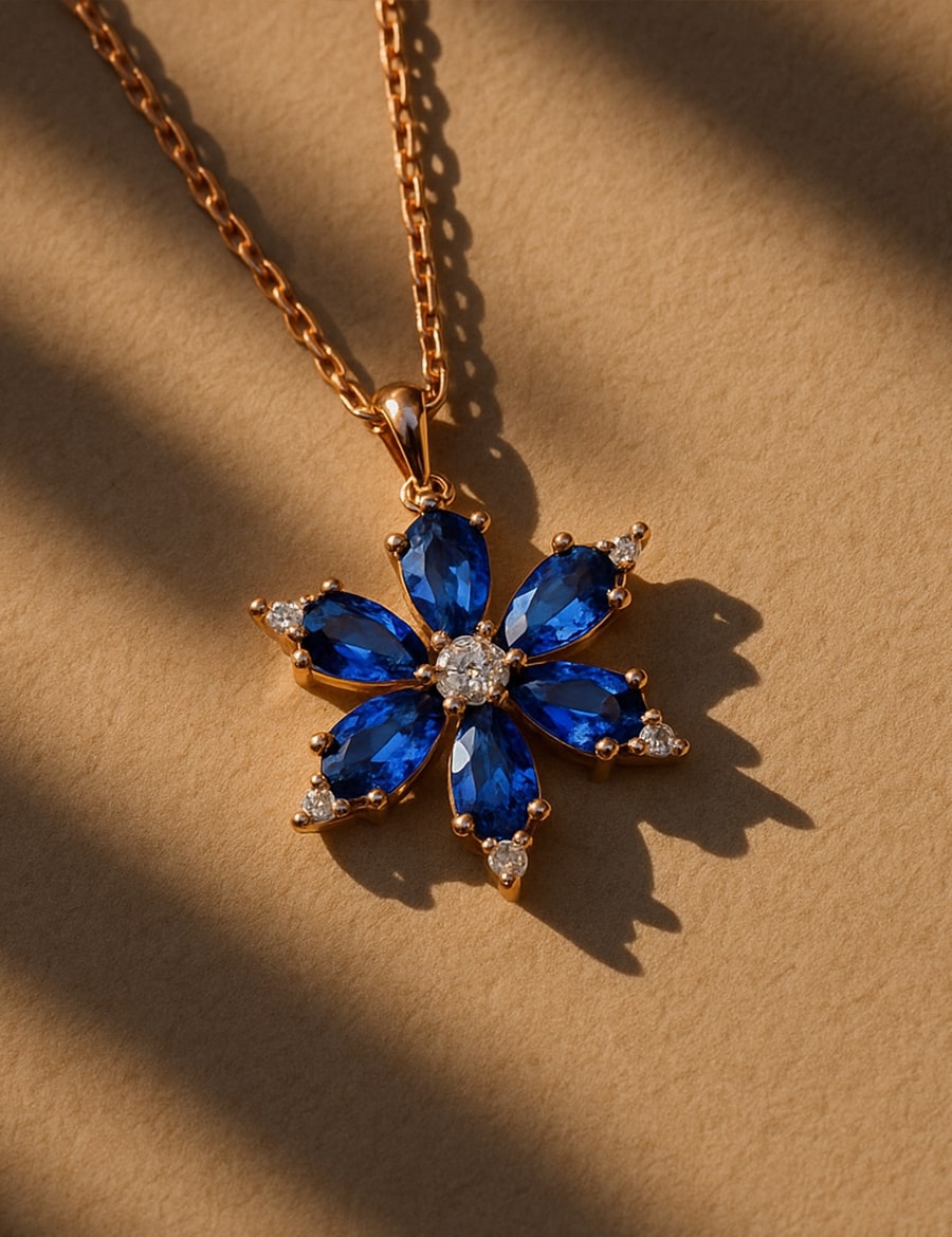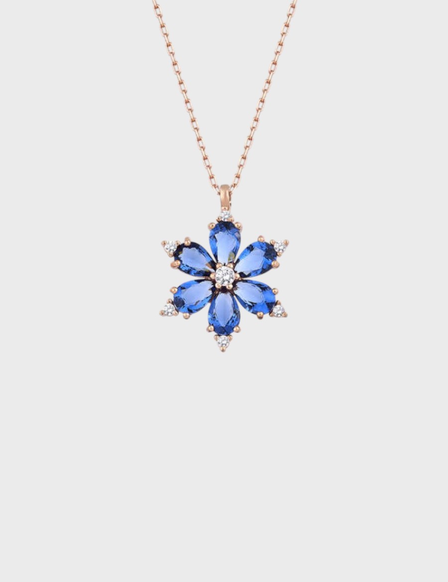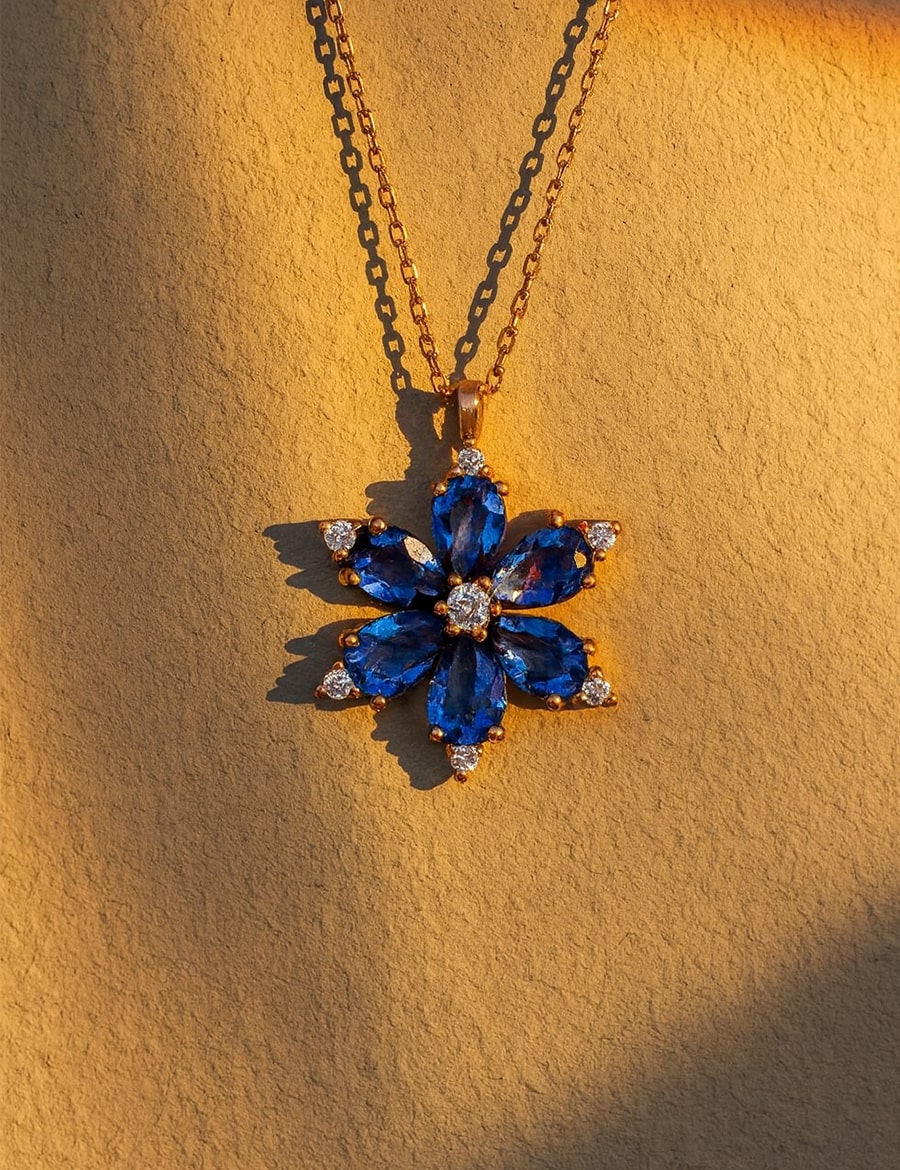 Sakura Bloom, baharın en büyüleyici anlarından ilham alınarak tasarlanmış özel bir kolyedir. Zarif gold zincir üzerinde yer alan çiçek formundaki kolye ucu, mavi ametist taşlarıyla sakura çiçeklerinin zarafetini simgeler. Her bir yaprak, ışığı yakalayan dikkatle kesilmiş damla formunda ametist taşlardan oluşur ve uç kısımlarda yer alan taşlarla tamamlanır.