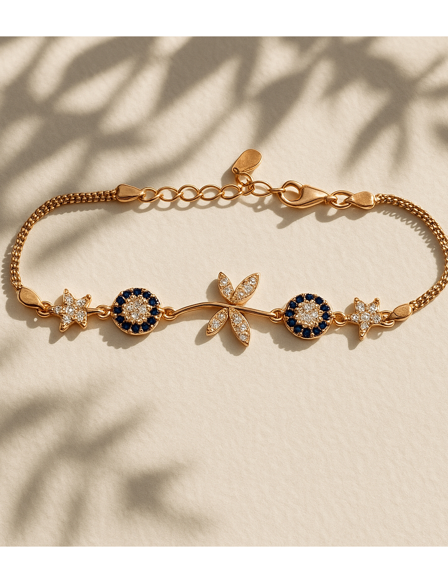 Celestial Bloom Gümüş Bileklik, gökyüzünün ışıltısını doğanın zarafetiyle buluşturur. İnce yıldız ve çiçek motifleri, mavi ve beyaz taşların dengeli parıltısıyla birleşerek bileğinizde sıcak bir enerji oluşturur. 925 ayar gümüş üzerine 14 ayar altın kaplama, ışıltısını uzun süre koruyan bir parlaklık sunarken, detaylı işçiliğiyle feminen ve sofistike bir görünüm sağlar. Gündüz kombinlerinden gece davetlerine kadar her anın tamamlayıcısı olacak bu tasarım, zarif bir doğallığı temsil eder. Celestial Bloom, yıldızların enerjisini ve çiçeğin dinginliğini taşıyanlar için tasarlandı.