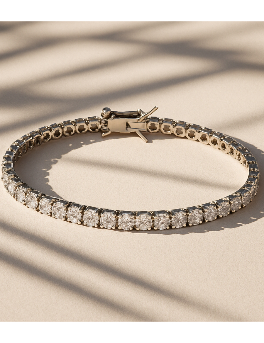 Classic Grace Gümüş Taşlı Tenis Bileklik, şıklığın en sade ve en zarif hâlini temsil eder. Yuvarlak kesim taşların eşit aralıklarla dizildiği bu model, ışığı her açıdan kusursuz bir şekilde yansıtarak bileğinizde büyüleyici bir parlaklık yaratır. 925 ayar gümüş gövdesi uzun ömürlü parlaklık sunarken, dayanıklı kilit sistemi güvenli kullanım sağlar. İster özel davetlerde, ister günlük kombinlerde tercih edin — bu model her zaman asil bir görünüm kazandırır. Classic Grace, sade ışıltısıyla zarafetin sessiz gücünü taşıyanlar için tasarlandı.