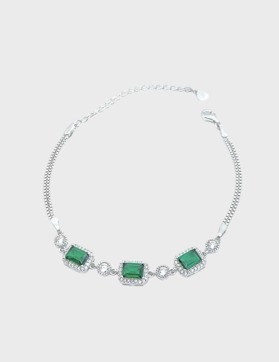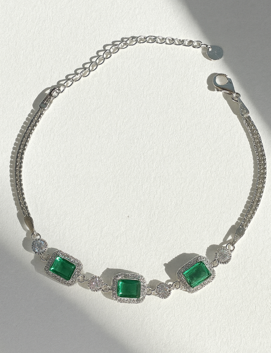Emerald Charm, adını taşıdığı gibi yeşilin büyüsünü bileklerde zarif bir şekilde taşır. Her biri özenle yerleştirilmiş zümrüt yeşili taşlar, 925 ayar gümüşün parlaklığıyla buluşarak eşsiz bir uyum yakalar. Taşların çevresini saran pırlanta efektli minik zirkon detaylar, tasarıma ışıltı ve derinlik katar. Ayarlanabilir zincir yapısı sayesinde her bileğe mükemmel şekilde oturur. Hem günlük kullanıma hem özel davetlere uygun olan bu bileklik, zarif bir duruşu modern dokunuşla birleştirir.