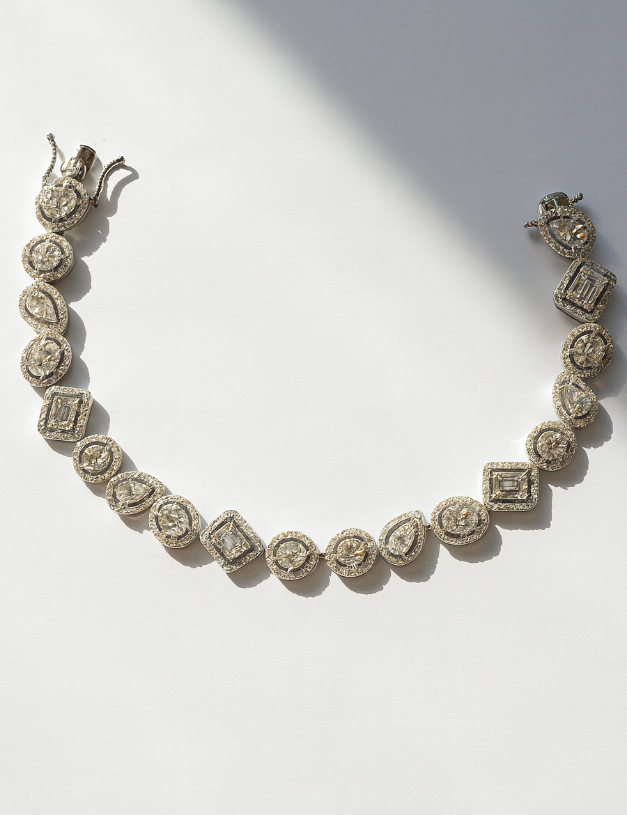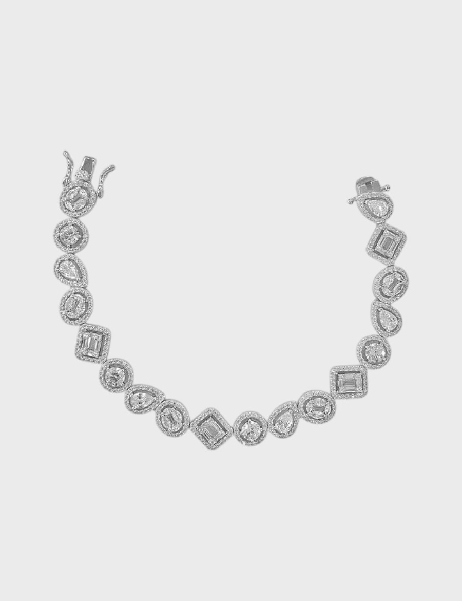 Eternal Shine, adını sonsuz ışıltısından alıyor. Her biri farklı kesimde özenle yerleştirilmiş taşlar, 925 ayar gümüşün parlak dokusuyla birleşerek bilekte adeta bir yıldız ışıltısı yaratır. Yuvarlak, baget ve damla formundaki taşlar, ışığı farklı açılardan yansıtarak eşsiz bir parıltı etkisi sunar. Zarif hatları ve klasik formu ile hem gündelik kullanıma hem özel davetlere uyum sağlar. Dayanıklı klips yapısı güvenli bir kullanım sunarken, taşların ışıltısı uzun süre ilk günkü parlaklığını korur.