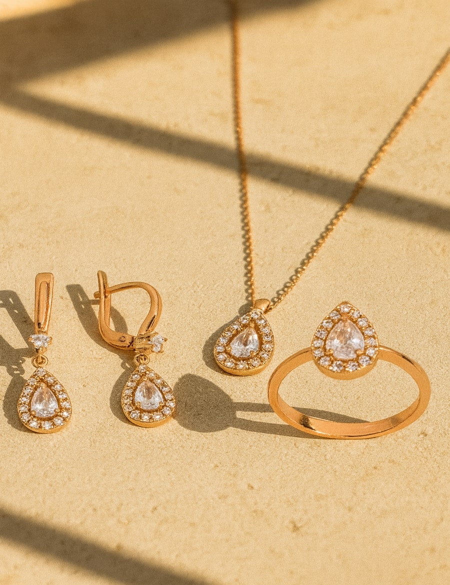 Golden Dew Set, damla kesimin doğal zarafetini 925 ayar gümüş üzeri altın kaplama dokusuyla buluşturuyor. Kolye, küpe ve yüzükten oluşan bu set; merkezdeki damla taşın saflığını çevresini saran parıltılı taşlarla taçlandırıyor. Altının sıcak tonlarıyla birleşen bu tasarım, günlük hayatta sofistike bir dokunuş, özel günlerde ise göz kamaştırıcı bir ihtişam sunuyor. Golden Dew, Thinkamore’un modern ve zamansız şıklığını altın ışıltısıyla öne çıkaran seçkin setlerinden biridir.