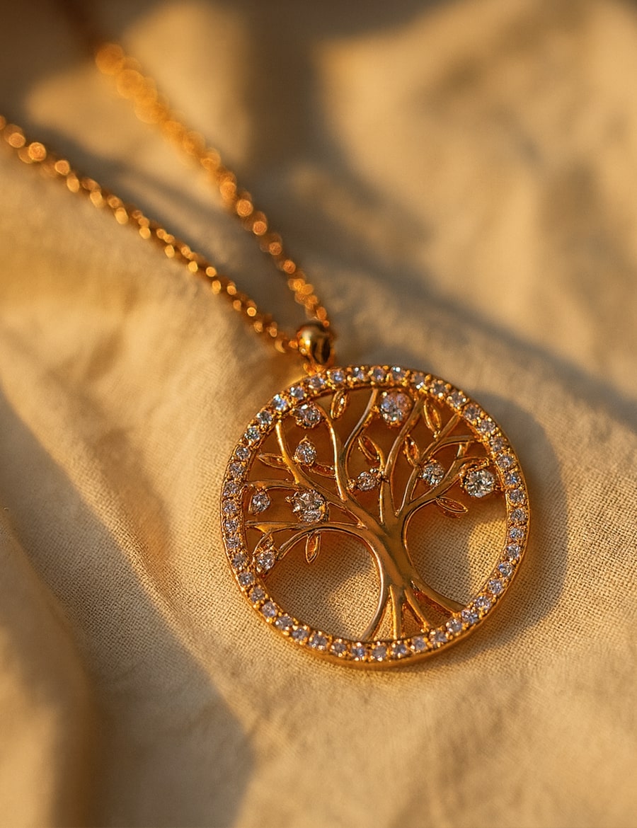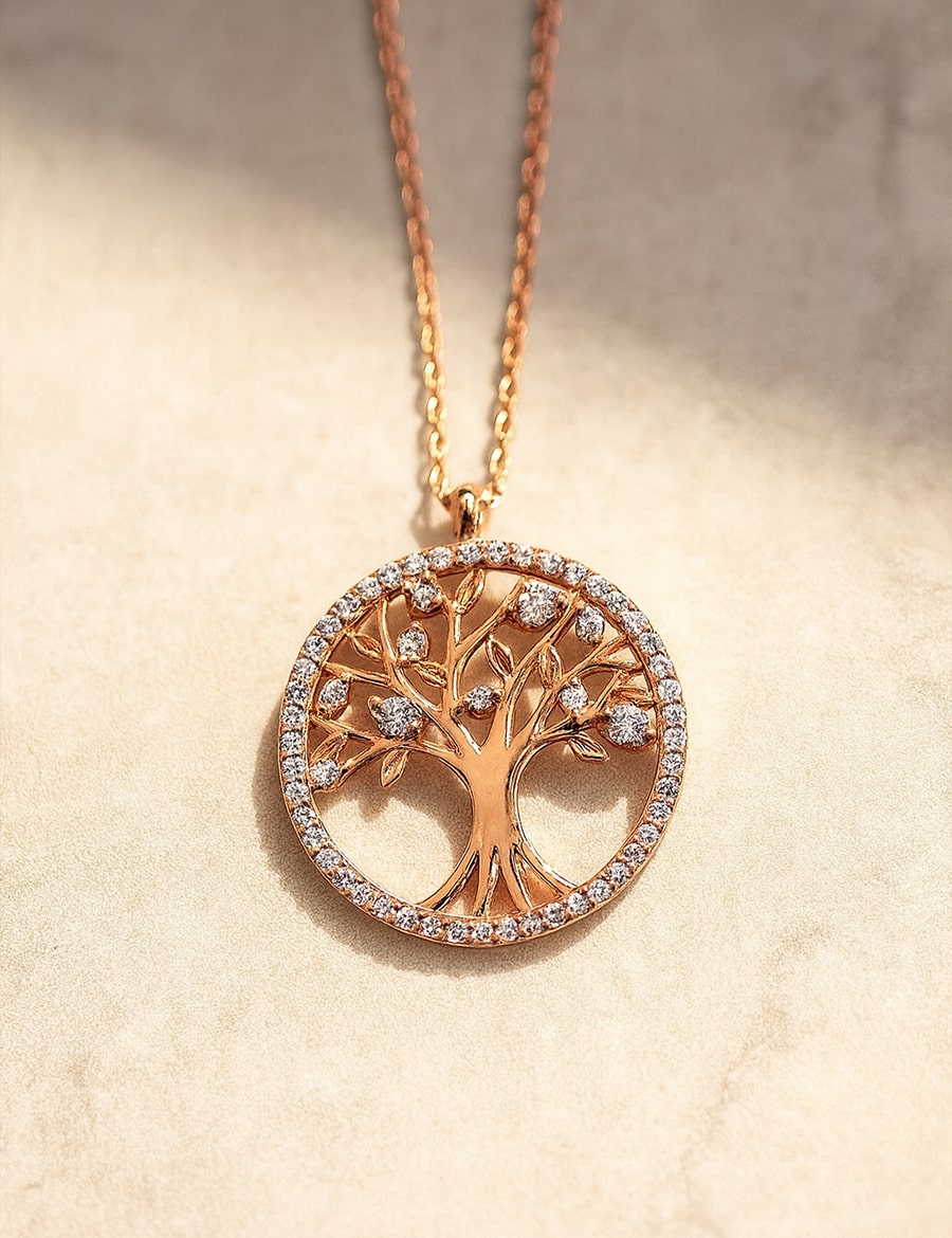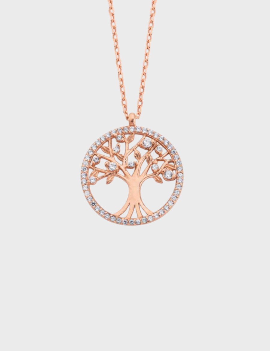 Işıltılı taşlarla süslenmiş bu “Hayat Işıltısı” kolye; kökleri geçmişe, dalları geleceğe uzanan hayat ağacının, umut, bereket ve sevgiyle dolu mesajını taşıyor. Zarif tasarımı ve parlayan detaylarıyla her anınıza anlam katmak için tasarlandı.