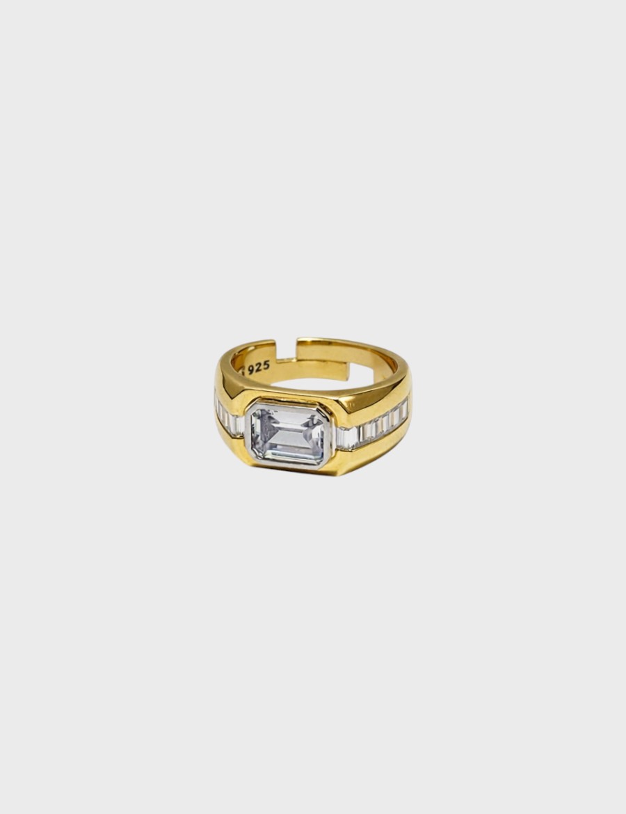 Imperial Luxe Ring, yüksek mücevher estetiğini modern bir yorumla buluşturan göz alıcı bir tasarım sunar. 925 ayar gümüş üzerine uygulanan altın kaplama, yüzüğün güçlü formunu daha belirgin kılarken; merkezdeki emerald-cut parlak fancy taş tüm ışığı kusursuzca yansıtır. Yan yüzeylere yerleştirilen baguette fancy taş detayları ise tasarıma zarif bir derinlik ve sofistike bir karakter kazandırır.