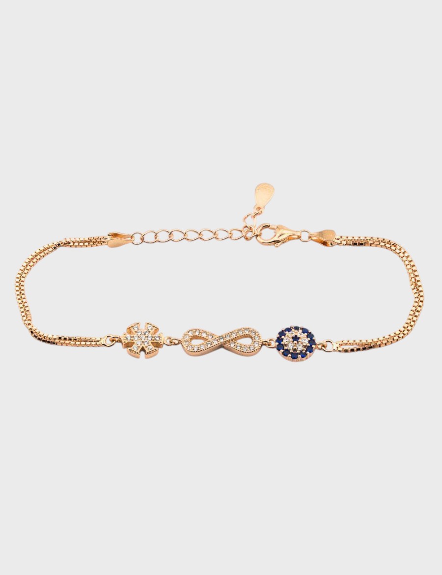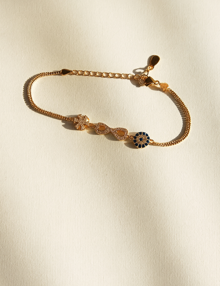 Infinite Harmony 14 Ayar Gold Kaplama Gümüş Bileklik, zarif tasarımıyla yalnızca bir aksesuar değil, aynı zamanda bir anlam bütünlüğüdür. Üzerindeki kalp motifi sevgiyi, sonsuzluk sembolü bağlılığı, nazar detayı ise korumayı temsil eder. Bu üç güçlü sembol, bileğinizde zarafetle birleşerek hem estetik hem duygusal bir bağ kurar. 14 ayar altın kaplamasıyla sıcak bir ışıltı sunarken, 925 ayar gümüş gövdesi uzun ömürlü dayanıklılık sağlar. Ayarlanabilir zinciri sayesinde her bileğe mükemmel uyum sağlar. Hem günlük kullanıma hem özel anlara uygun olan bu model, taşıyan kişiye anlam dolu bir enerji kazandırır. Infinite Harmony, aşkı, korumayı ve sonsuzluğu bir araya getiren eşsiz bir zarafet ifadesidir.