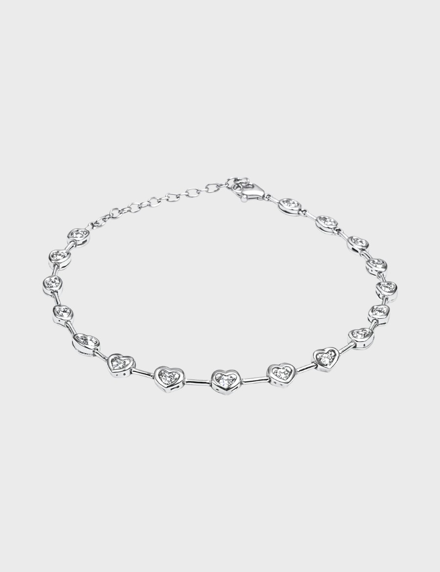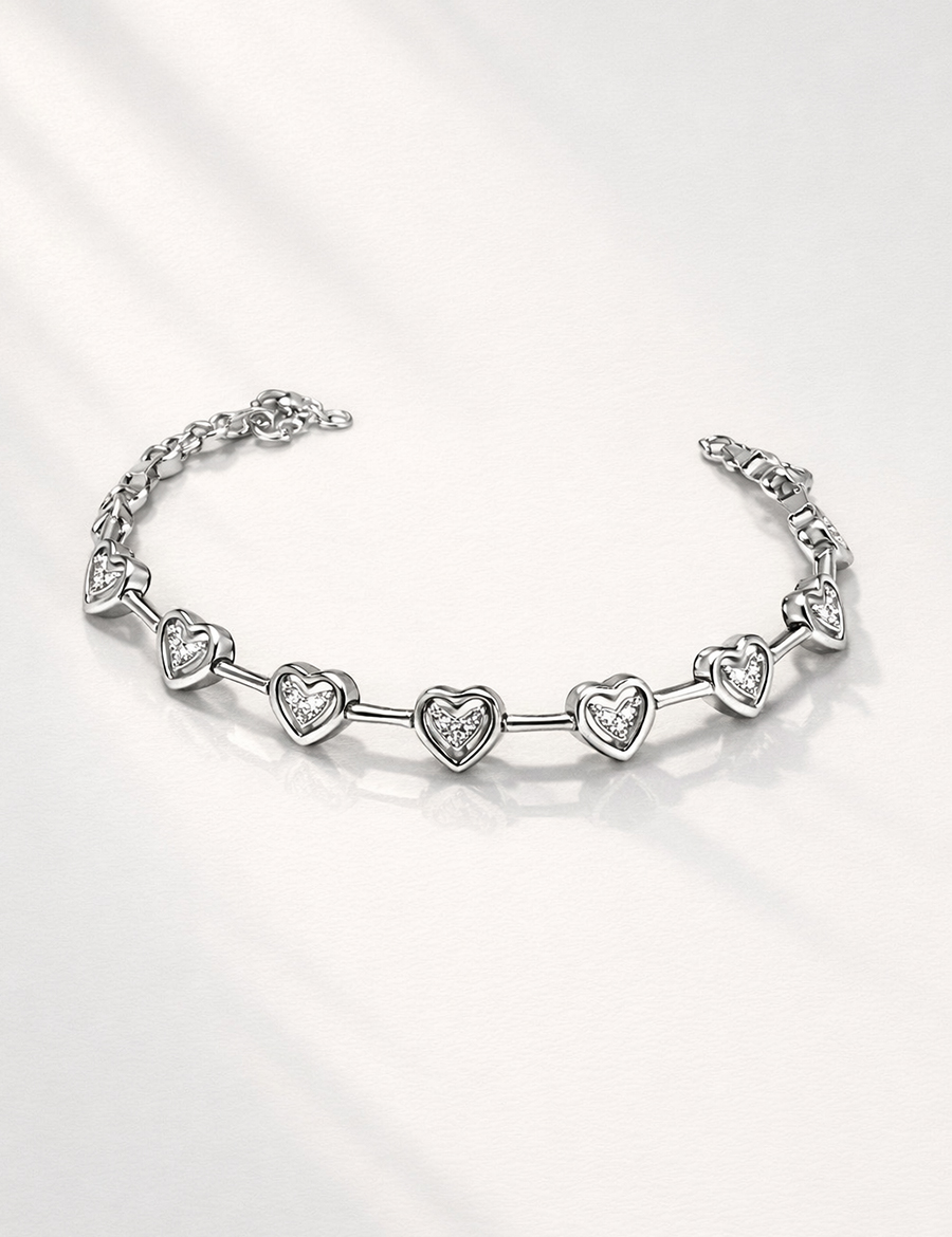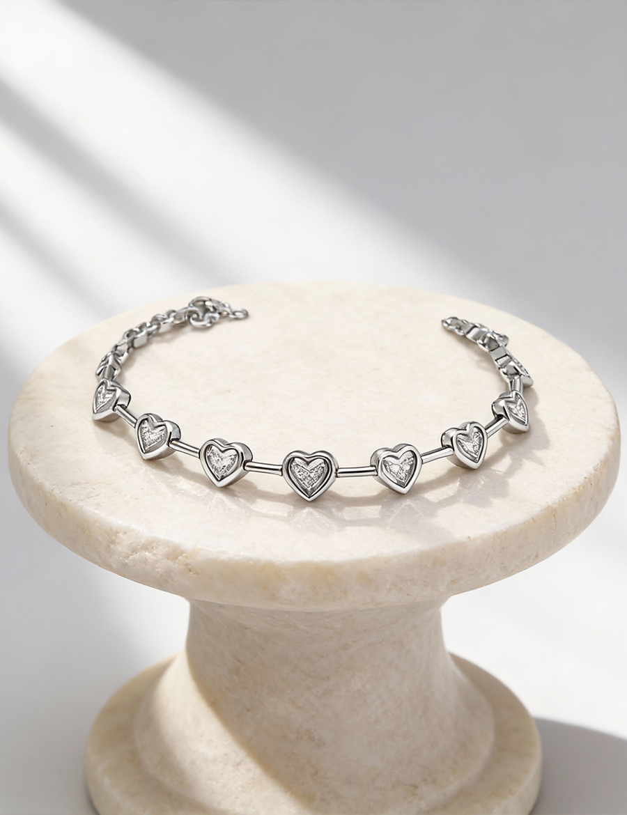 925 ayar gümüş gövde, temiz hatları ve net formuyla bilekliğe hem zarif hem de yüksek moda etkisi katan bir parlaklık sunar. İnce bağlantılar, bilekliğe hafiflik ve akış hissi verirken; kalplerin ardışık dizilimi sevginin sürekliliğini simgeler.