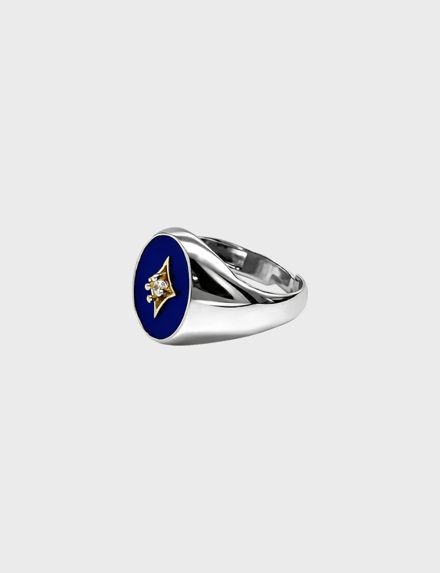 Midnight Star Ring, gece gökyüzünün derin lacivert tonundan ve yıldızların zamansız parıltısından ilham alan modern bir mücevher tasarımıdır. Lacivert zeminin ortasında yer alan altın yıldız motifi, merkezdeki parlak fancy taşla birleşerek zarif bir ışıltı ve kozmik bir enerji oluşturur.