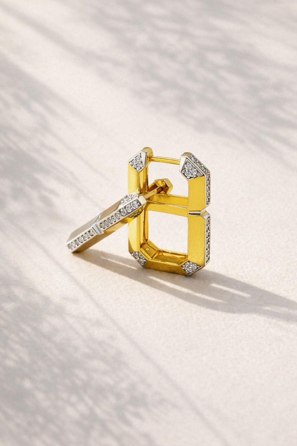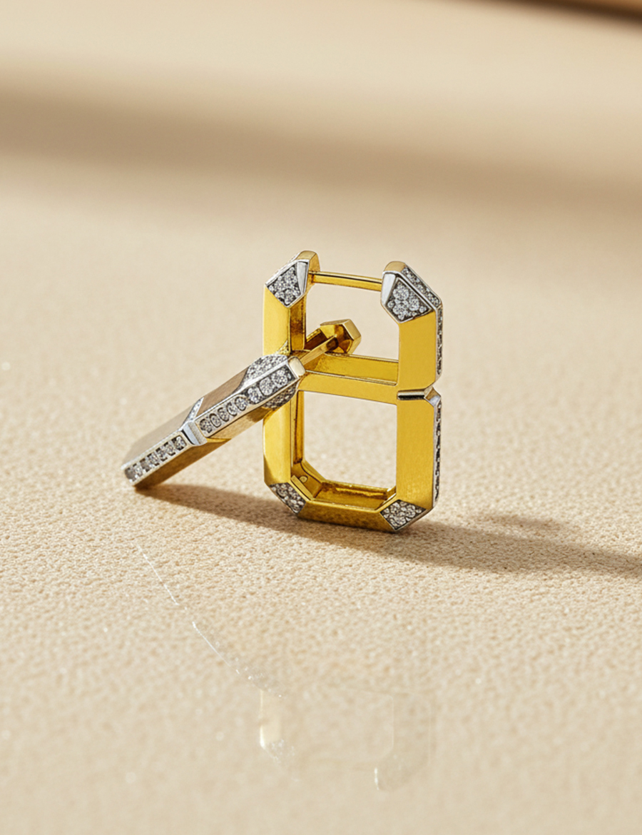 Nexus Frame Küpe, mimariden ilham alan geometrik formuyla klasik halka küpe anlayışını yeniden tanımlar. Kare çerçeve formu, zincir hissi veren bağlantı yapısıyla modern ve sofistike bir duruş sunar.