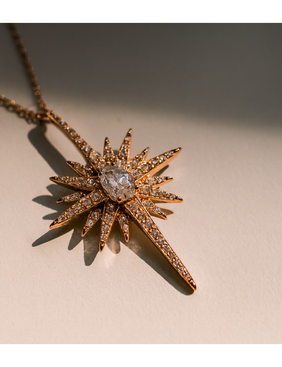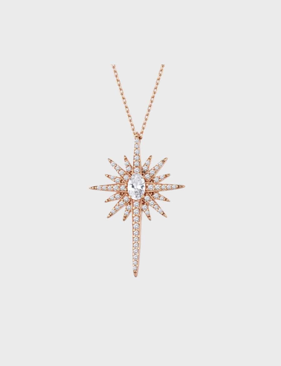 Polars Rose, karanlık gecelerde yön gösteren yıldızın zarafetini ve umudun parıltısını taşıyan bir tasarımdır. Tamamı 925 ayar gümüşten üretilen bu kolye, yüzeyine uygulanan 14 ayar roze gold kaplama ile sıcak, romantik bir ton kazanır. Merkezinde yer alan fancy kesim taş, ışığı tıpkı bir yıldız gibi yakalayarak etrafındaki taşlara yansıtır. Her bir detay, zarafet ve anlamın kusursuz uyumunu oluşturur: kutup yıldızı motifi rehberliği, umudu ve içsel dengeyi simgeler. Gündelik kombinlerde zarif bir ışıltı, özel davetlerde ise dikkat çekici bir merkez parçası olarak öne çıkan Polars Rose, sadece bir takı değil — ışığıyla ilham veren bir semboldür.