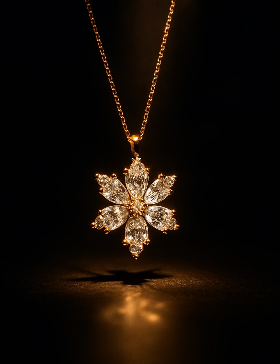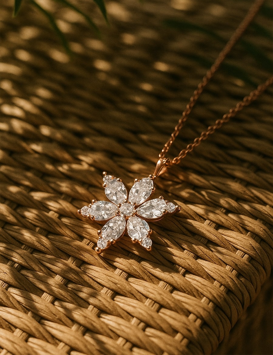Sakura Bloom, baharın en büyüleyici anlarından ilham alınarak tasarlanmış özel bir kolyedir. Zarif gold zincir üzerinde yer alan çiçek formundaki kolye ucu, gümüş ametist taşlarıyla sakura çiçeklerinin zarafetini simgeler. Her bir yaprak, ışığı yakalayan dikkatle kesilmiş damla formunda ametist taşlardan oluşur ve uç kısımlarda yer alan taşlarla tamamlanır.
