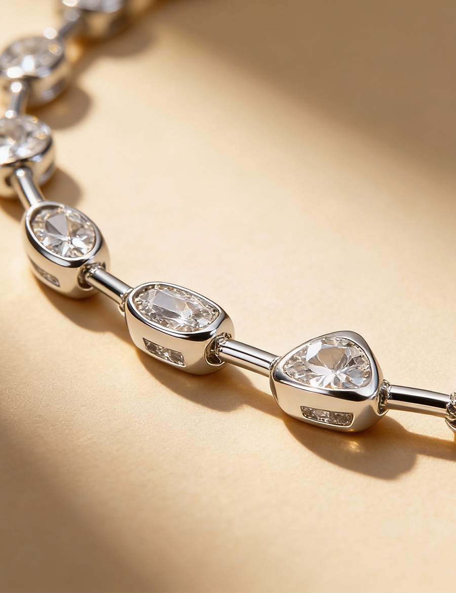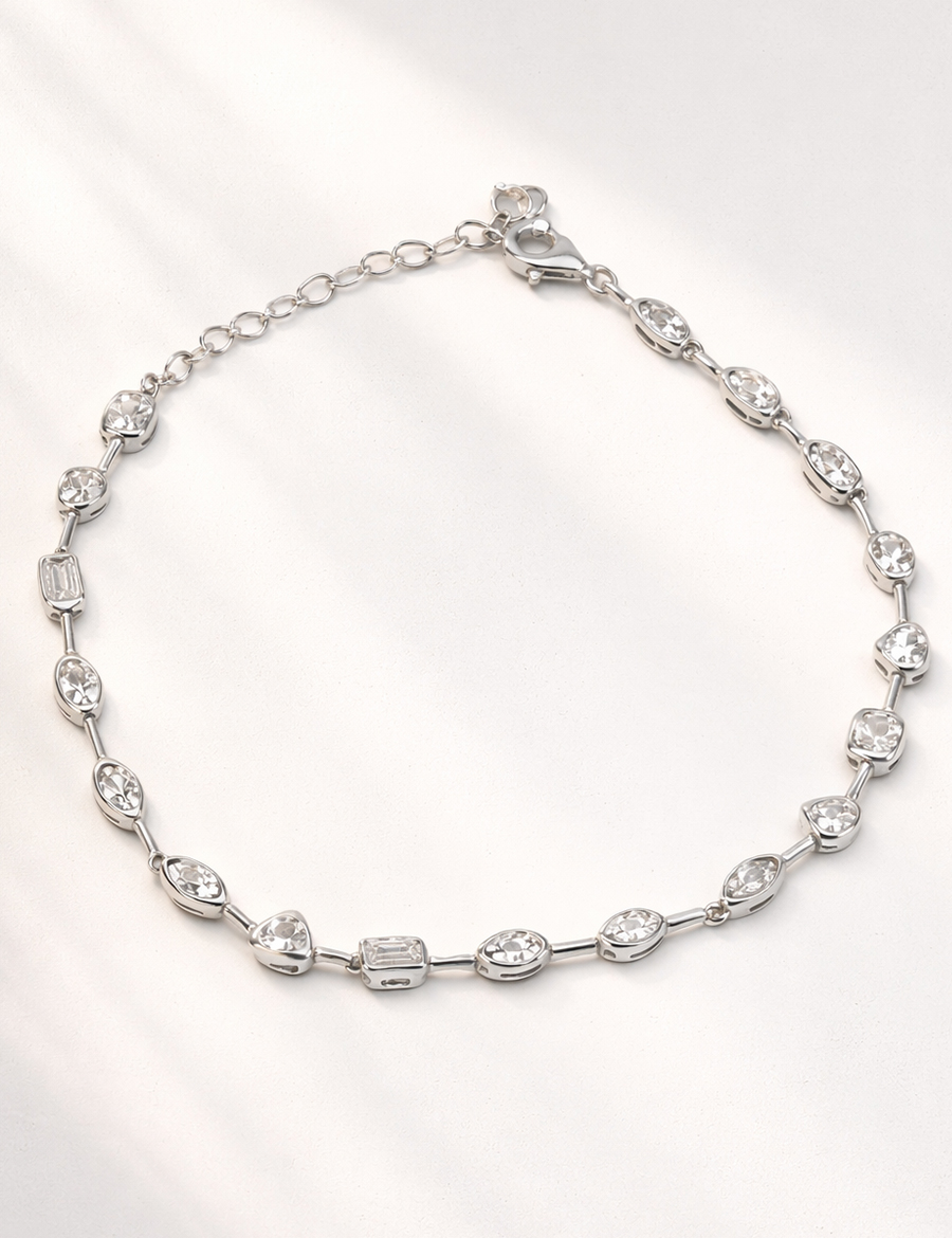 Silver Sequence Bracelet, tasarım adını bileklik boyunca düzenli bir akışla sıralanan farklı kesim fancy taşların oluşturduğu ritmik ışıltıdan alır. Oval, damla ve emerald kesim taşlar; ışığı her açıdan farklı şekilde kırarak bilekliğe sofistike ve modern bir parlaklık kazandırır.