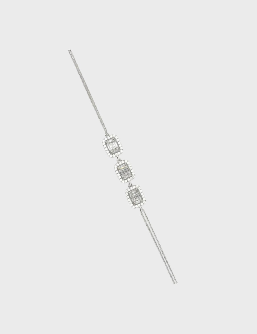 Tria Baguette, minimalizmin parıltısını modern çizgilerle buluşturan zarif bir tasarımdır. Üç baget taşın simetrik dizilimi, kusursuz bir denge ve uyum hissi yaratırken, çevresini saran ince zirkon taşlar tasarıma ışıltılı bir derinlik kazandırır. 925 ayar gümüş gövdesi, dayanıklılığı ve parlaklığıyla uzun ömürlü bir kullanım sunar. Zarif zincir formu bileğe hafifçe oturur, hem günlük kombinlerde hem özel davetlerde sade bir lüks hissi verir. Tria Baguette, sadelikte zarafet arayan kadınlar için özel olarak tasarlandı.