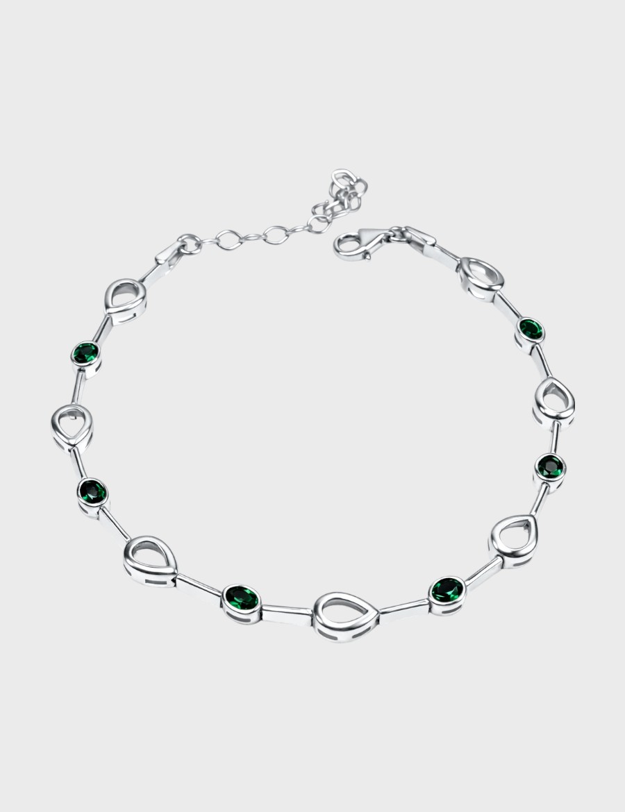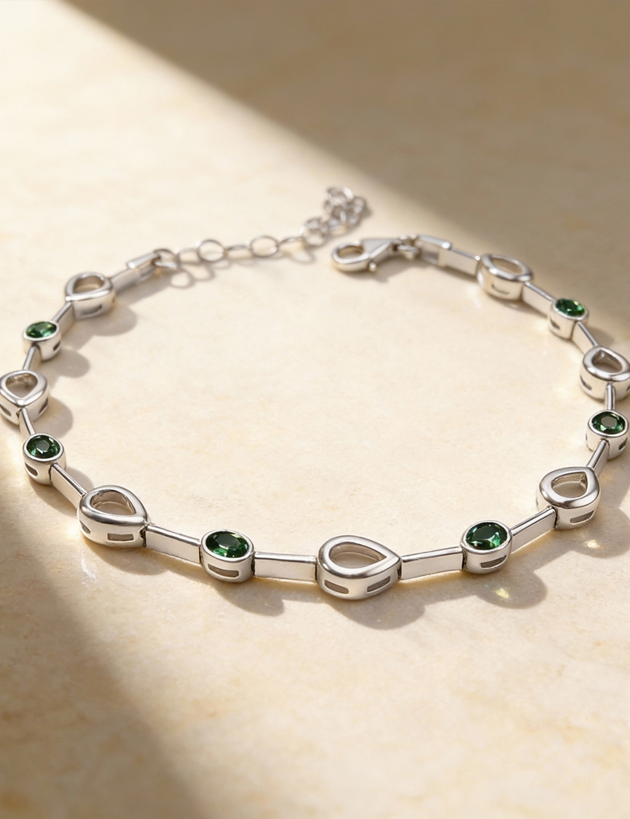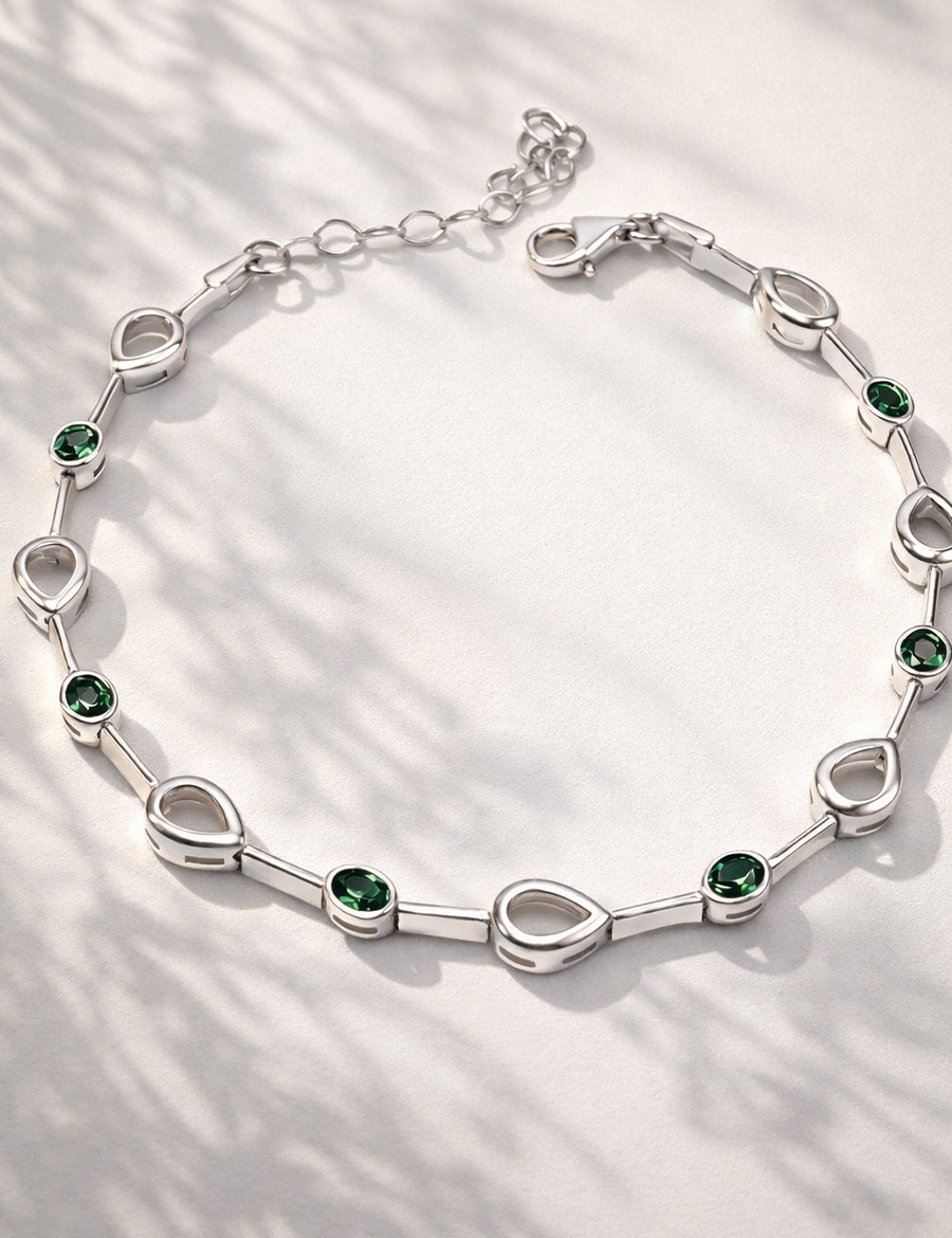925 ayar gümüşten üretilen gövde, minimal damla formlarıyla birleşerek modern, zarif ve yüksek moda hissi taşıyan bir çizgi oluşturur. Yeşil tonların sakinleştirici ve dengeleyici etkisi, bilekliğin her kullanımda özel bir aura taşımasını sağlar.